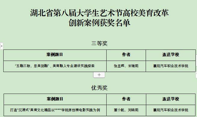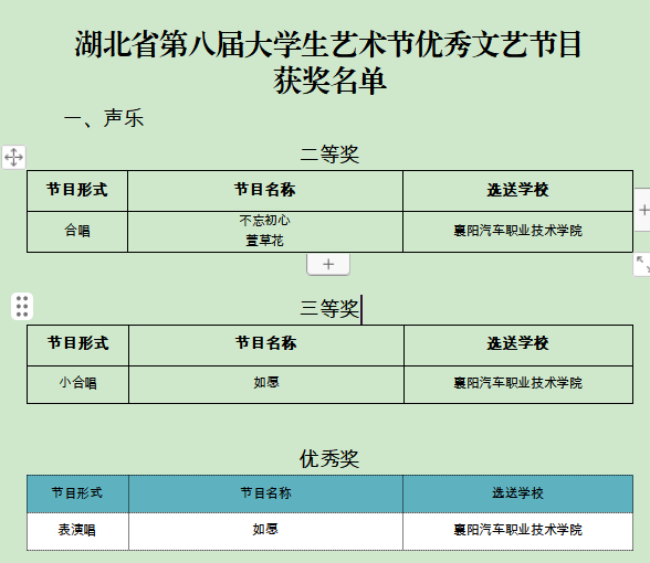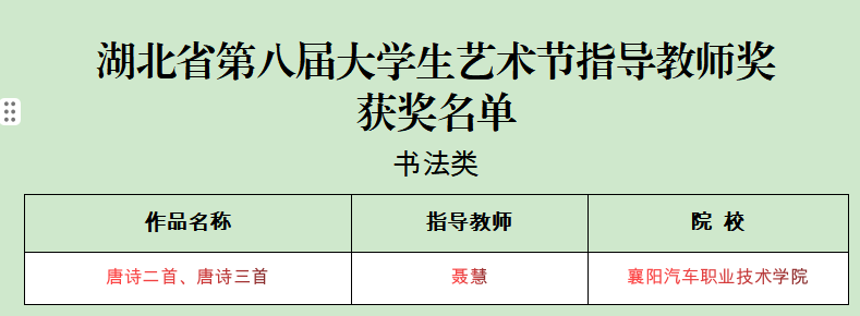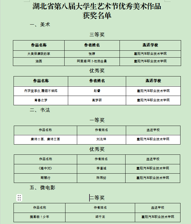 近日湖北省教育厅公布了此次艺术节获奖名单,我校师生以卓越的表演和独特的艺术才华,为学校争的多项荣誉。共荣获书法类、声乐类、绘画类、舞蹈类、微电影等16奖项,其中一等奖1项,二等奖2项,三等奖5项,优秀奖7项,优秀指导教师1项。