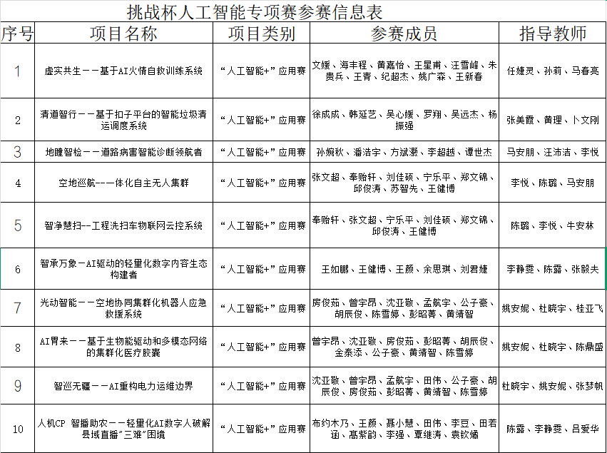 根据第十九届“挑战杯”中国移动全国大学生课外学术科技作品竞赛“人工智能+”专项赛参赛要求,经过院系推荐、项目初审、专家评议,现选拔以下项目团队代表襄阳汽车职业技术学院参加第十九届“挑战杯”中国移动全国大学生课外学术科技作品竞赛“人工智能+”专项赛。