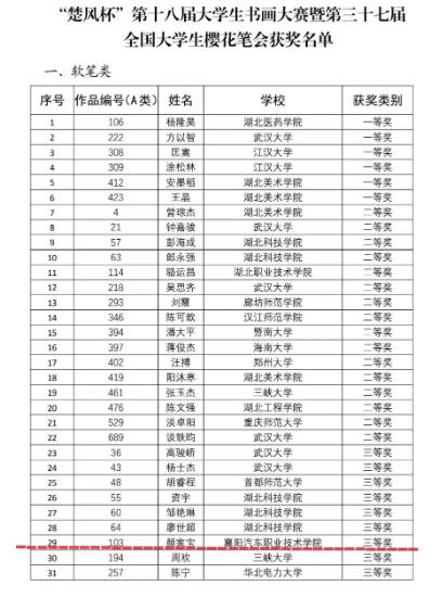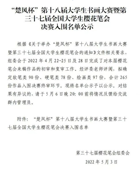 5月3日,“楚风杯”第十八届大学生书画大赛暨第三十七届樱花笔会决赛入围名单公示。恭贺我校颜家宝同学获得软笔组决赛三等奖,乔城同学获得硬笔组优秀奖。