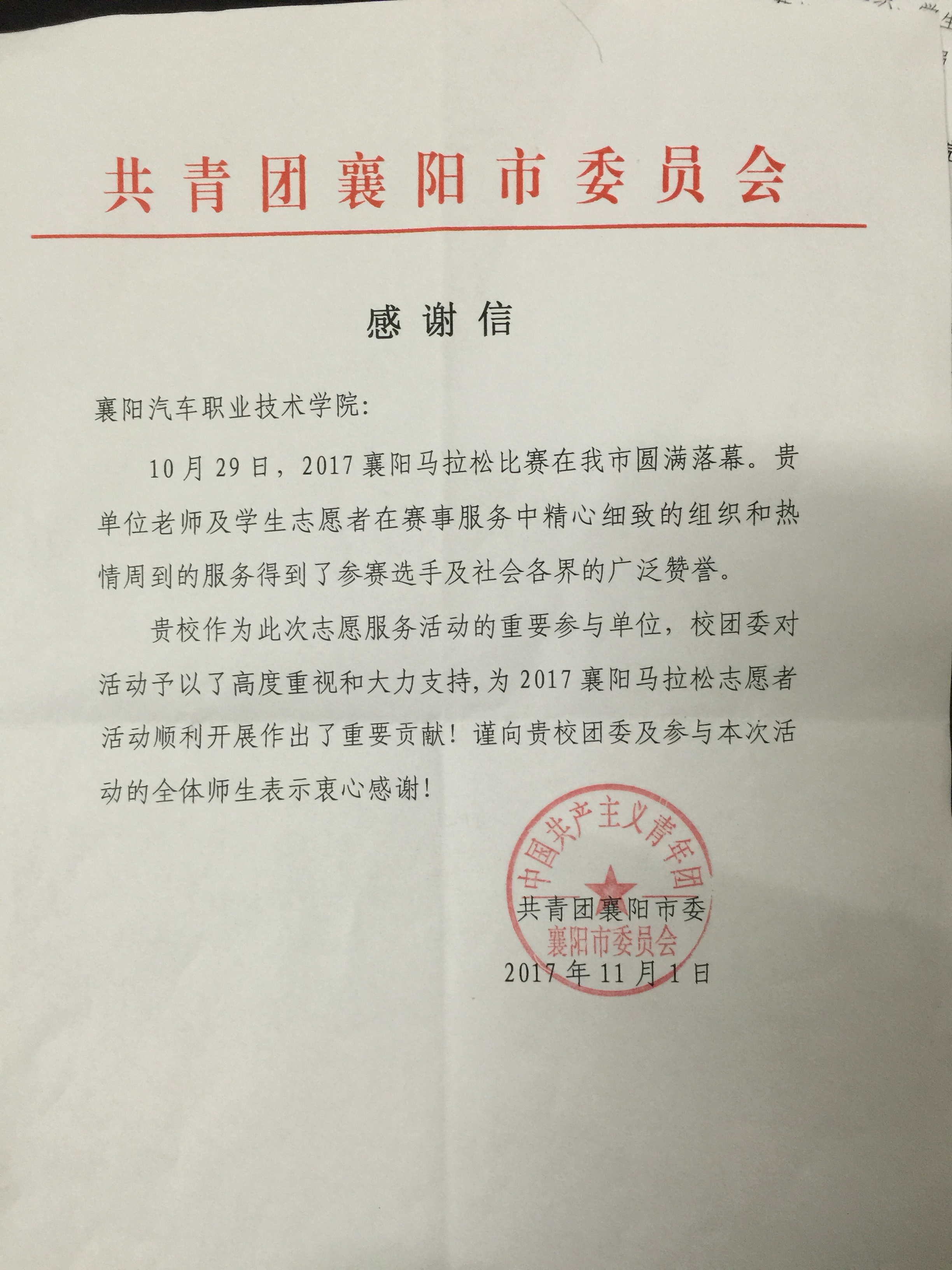 10月25日至29日,院团委积极组织256名青年师生志愿者参加2017年襄阳马拉松志愿服务活动,256名志愿者主要分布在博览会、赛事服务、赛道保障重点岗位上,面对服务时间长、保障难度高、工作强度大等困难,大家积极发挥勇于担当、务实肯干、团结协作、无私奉献的精神,为参赛选手提供了热情服务,为赛事成功举办提供了坚实可靠的志愿服务保障,以饱满的热情向社会各界来宾展现了襄阳汽车职业技术学院青年学子的良好精神风貌。经过努力,我院2名学生荣获“最美志愿者”称号、41名学生荣获“襄马优秀志愿者”表彰、5名教师荣获“襄马优秀指导教师”表彰。