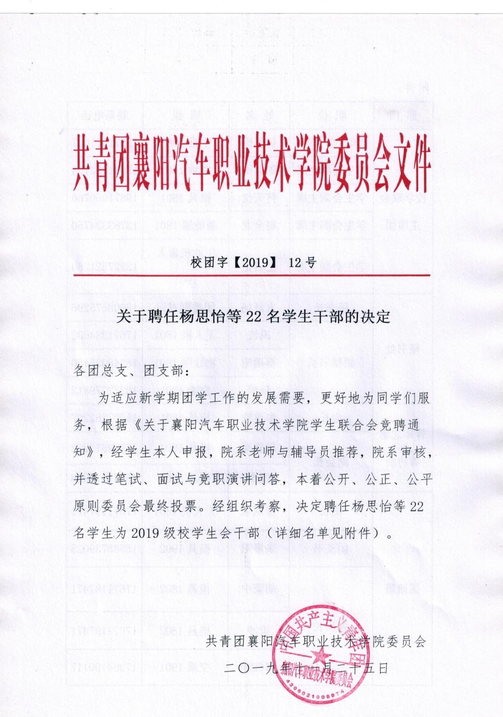 关于聘任杨思怡等22名学生干部的决定