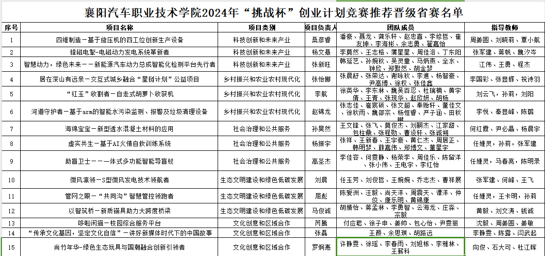 经学术不端检测、校赛初赛、专家评审,确定15件作品代表我校参加第十三届“挑战杯”湖北省赛,现予以公示(具体名单附后)。